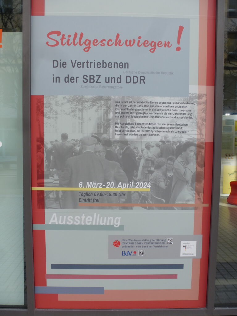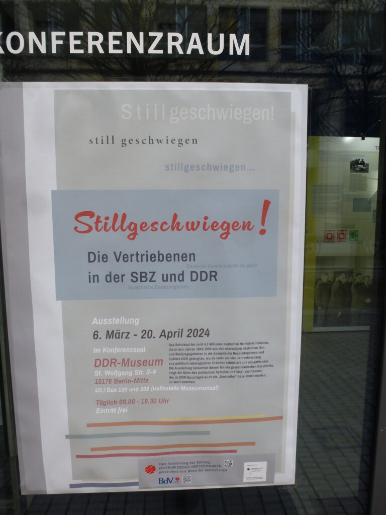 Die Stiftung „ Zentrum gegen Vertreibung“ hat eine Ausstellung mit dem Titel „Stillgeschwiegen – die Vertriebenen in der SBZ und DDR“ konzipiert. Diese wurde nun im Konferenzsaal des DDR-Museums erstmals präsentiert. Als stellvertretender OMV-Bundesvorsitzender nahm Heiko Schmelzle an der Ausstellungseröffnung teil. Da die Familie seiner Mutter aus dem Spreewald stammt (allerdings schon früh über die grüne Grenze flüchtete), war das Thema für ihn auch persönlich von großem Interesse. Die Ausstellung soll in der Folge auch an anderen Orten gezeigt werden.