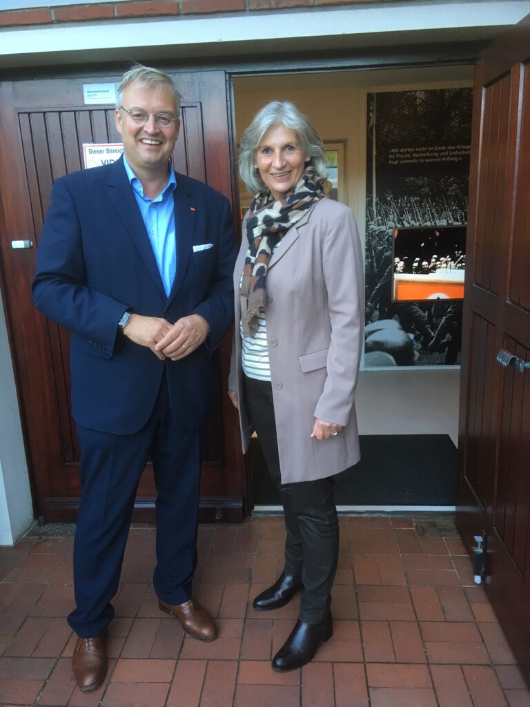 Das Vorgespräch führten die Landesbeauftragte Editha Westmann und Ewa Kruppa vom Museum Friedland. Heiko Schmelzle überreicht Editha Westmann ein persönliches Geschenk als Dank für die langjährige gute Zusammenarbeit – insbesondere mit ihrem Verbindungsbüro als Landesbeauftragte.