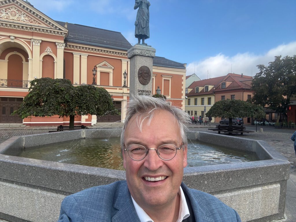 Heiko Schmelzle vor dem Brunnen, den die deutsche Minderheit noch vor dem Fall des Eisernen Vorhangs im Jahre 1989 wieder aufgebaut hatte.